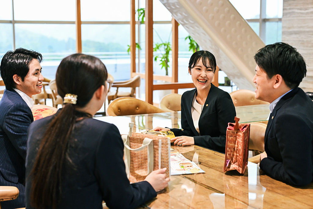 高知信用金庫では、お客様にご満足いただけるよう、様々なキャリアの職員が力を合わせ、チーム一丸となって取り組んでいます。また、若手職員の育成や女性管理職の登用などにも力を入れており、チーム全員がそれぞれの役割でリーダーシップを持ち、能力発揮できるとてもやりがいのある職場環境となっています。