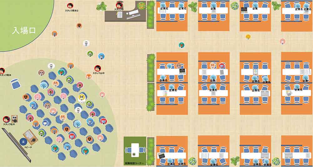 アバターを使って近くの人と会話したり、会場内を自由に動けるので、より対面に近い合同企業説明会になっています。