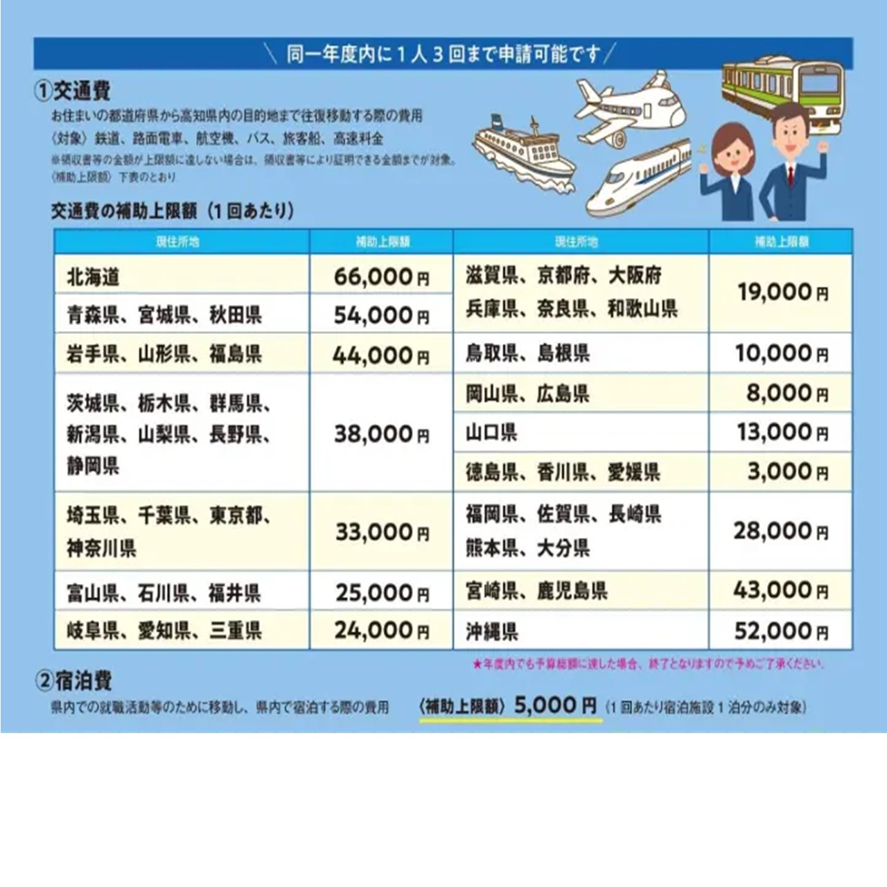 この制度は、県外在住の学生や既卒3年以内の皆さんが、高知県内での就職活動等を行う際に、県外の住所地から県内の目的地までの移動や宿泊に要した経費の一部を支援するものです。