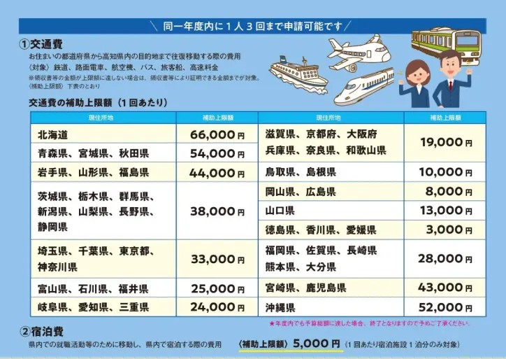 この制度は、県外在住の学生や既卒3年以内の皆さんが、高知県内での就職活動等を行う際に、県外の住所地から県内の目的地までの移動や宿泊に要した経費の一部を支援するものです。